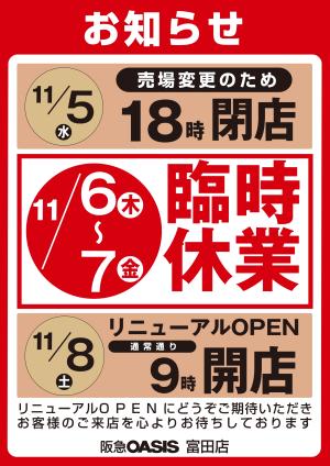 11月6日(木)〜7日(金)富田店 臨時休業のお知らせ