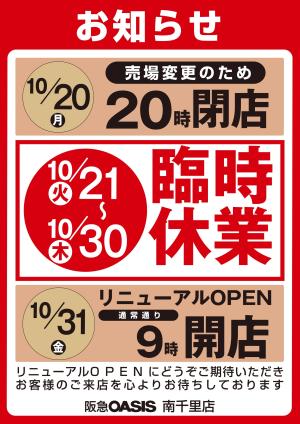10月21日(火)〜10月30日(木)南千里店 臨時休業のお知らせ